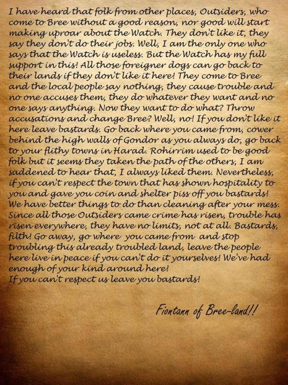 This is the letter Fiontann wrote for the Watch and to show his support towards them against the foreigners.