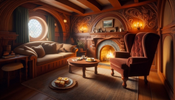 Now me livin' room be be best of all. I be but a simple Hobbit, but Miss Octavia, who had this Burrow afore me, had done it up right smart. Too smart fer me really.